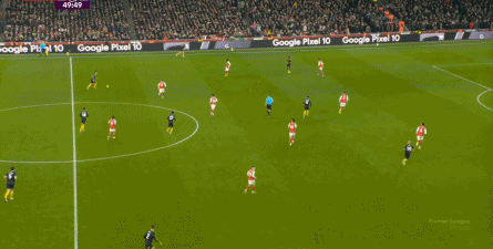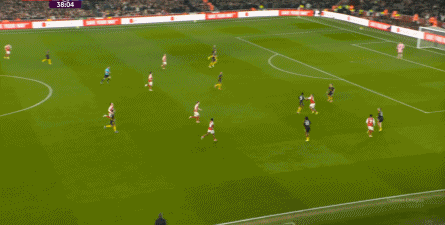 对阵曼城的第一个进球,当然是来自本方半场防下的任意球,但你要注意看到的是,在布鲁诺带球快速向前的路上,多尔古、姆贝乌莫和阿玛德-迪亚洛全部都在冲刺: